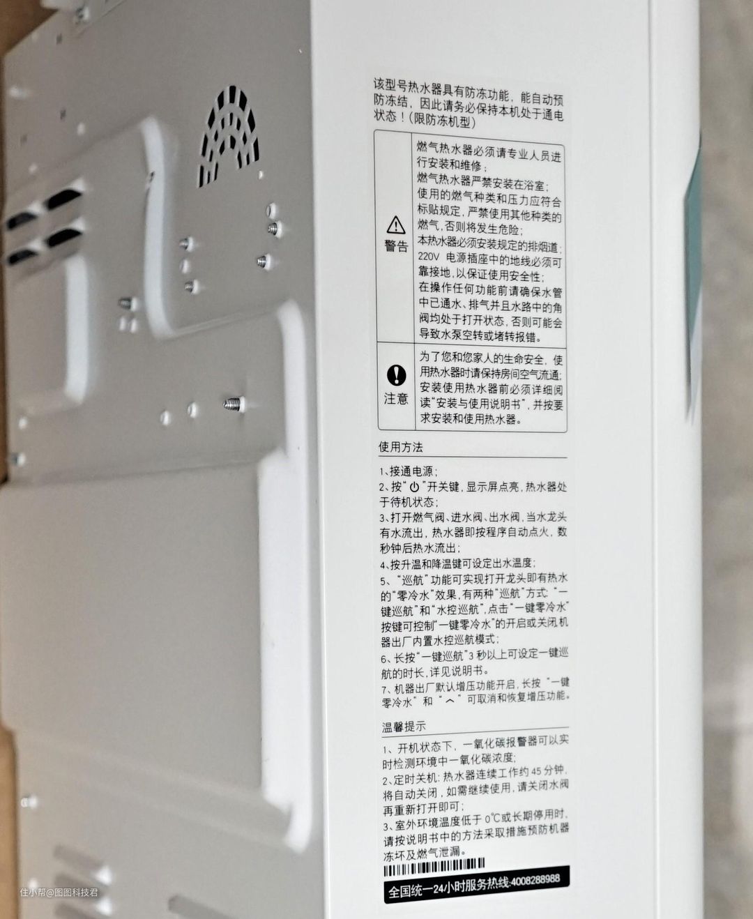 在右侧提示注意事项,使用方法和温馨提示 服务热线。提示使用的人,保证安全和舒心的使用。