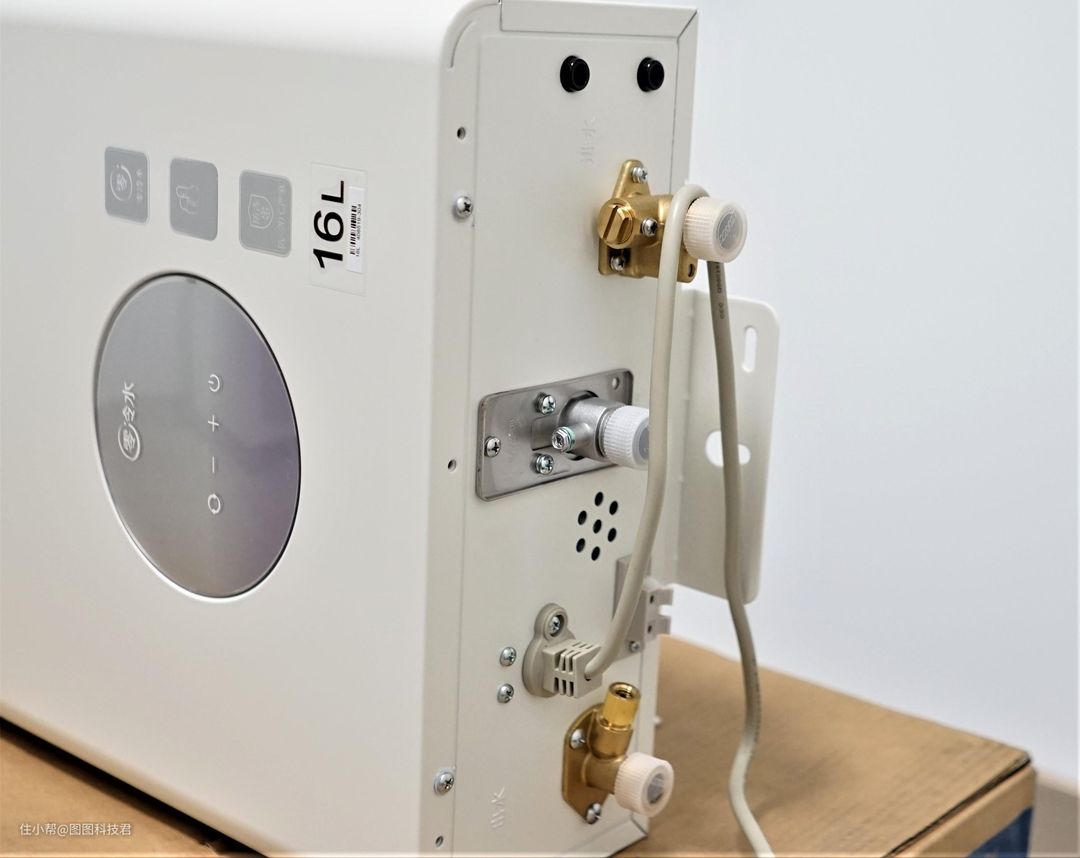 在主机底部,除了长长的电源线之外,左右两边分别是出水口(热)和进水口(冷),中间则是天然气进气接口。