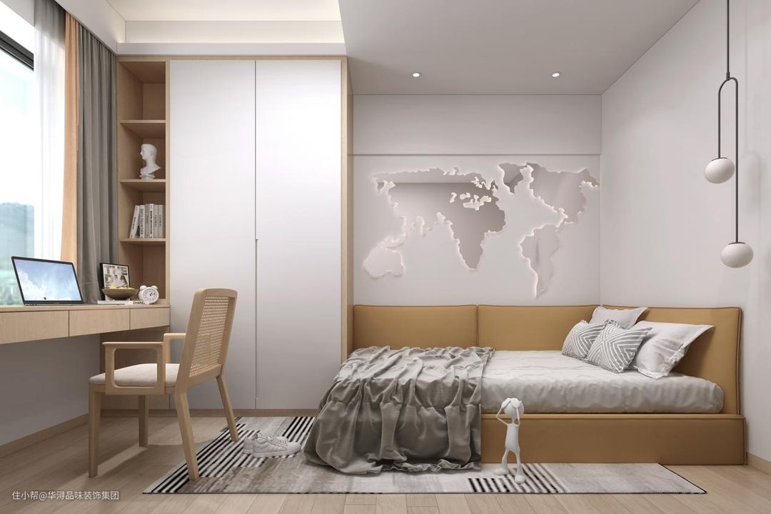为了让儿童房有更温暖的感觉,特意将灰色地砖换成了原木色的地板,同时室内的床、桌椅等家具也使用原木色,这让整个卧室环境都更贴近大自然,气氛更加温和。