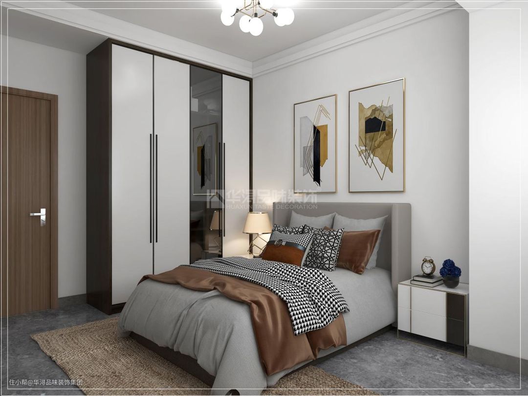 床左侧墙边选用了一组四开门的大衣柜,作为主卧衣物的储藏空间。在床头上方,悬挂了并列的两幅现代艺术挂画,这种挂画现代艺术感强,同时市场价格不贵,是点缀空间、营造氛围最有性价比的一种选择。