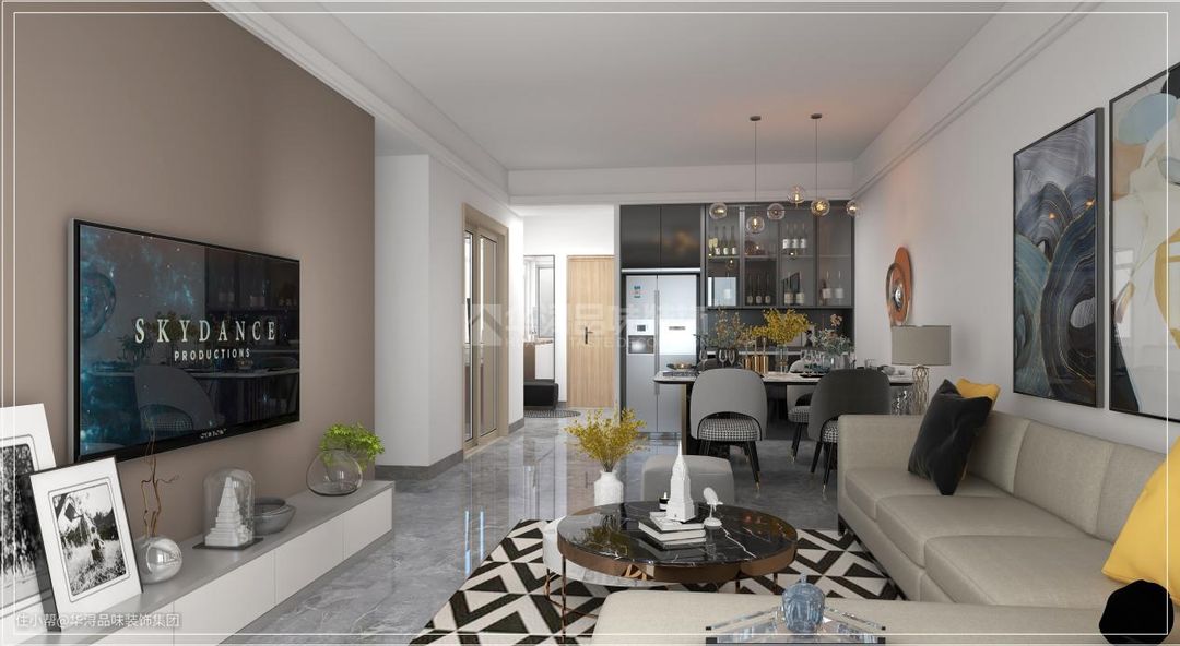 整个起居空间以灰色亮光地砖和白色乳胶漆墙面为基础背景色。这样的搭配既清爽又明亮,能在视觉上扩大空间面积,显得房屋更宽敞。