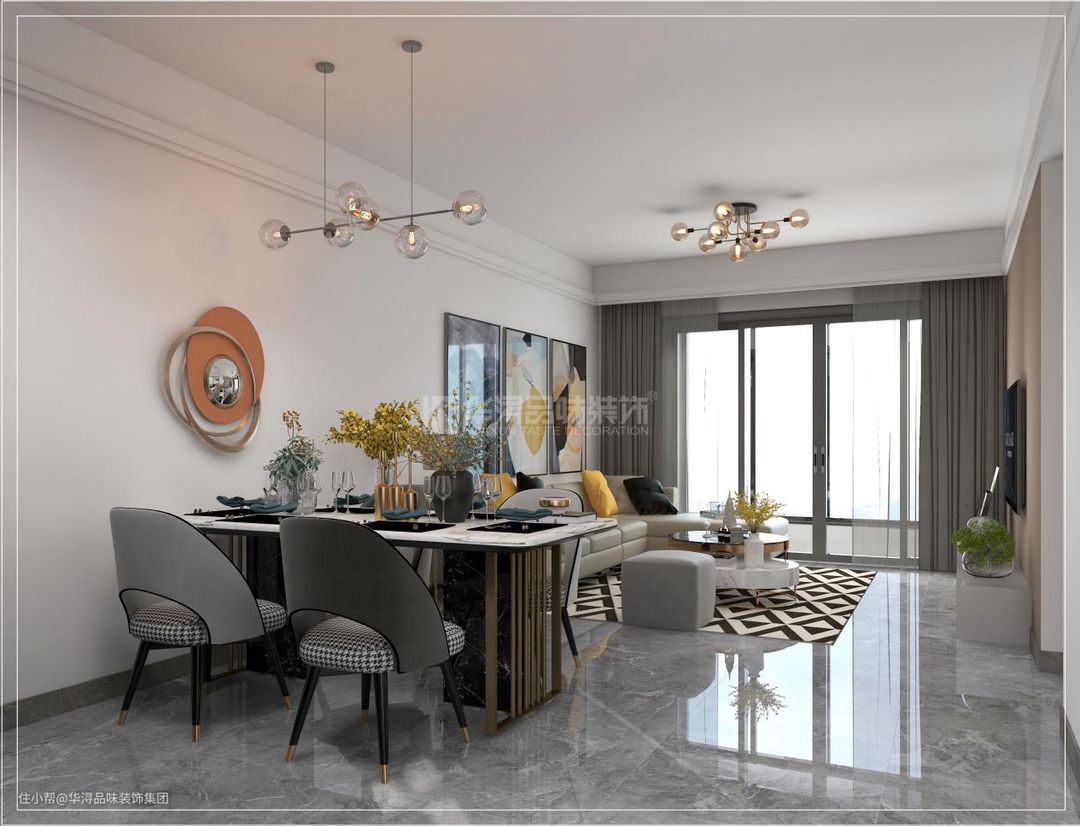 由于起居空间面积限制,餐厅和客厅之间没有明显的分界线,这样可以让整个空间看起来更整体、更宽阔。餐厅使用了和客厅同风格的吊灯,只是在造型上有所简化,更适合环境氛围轻松的餐厅。