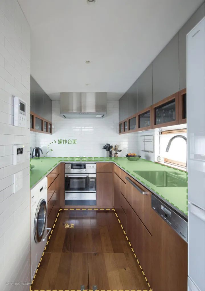 地柜深度常规一般在30cm-35cm之间,在保证过道大约80cm-105cm基础上,压缩U型操作台的宽度,最小做到25cm-30cm不会影响使用,妥妥地U型布局,操作宽松,又提升日常收纳力度。