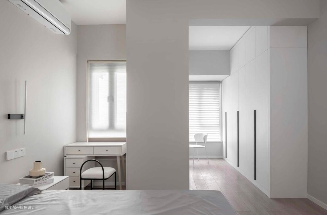 考虑到原主卧面积、采光有限,将旁边的小房间打通,并以功能间来定位,则立马缓解了原空间的闭塞感,且还延伸出了衣帽间、书房的功能。而临窗设计的梳妆台,也满足了女主的日常生活需求。