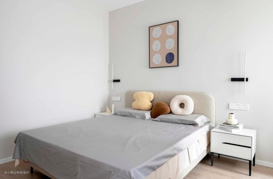 来到主卧,整体延续了简约的基调,不过为了让空间看起来更加轻柔,墙面乳胶漆则做了一个调色处理。这样既与白色的顶面,形成了立体的层次,也让空间氛围更加静谧、温馨了。