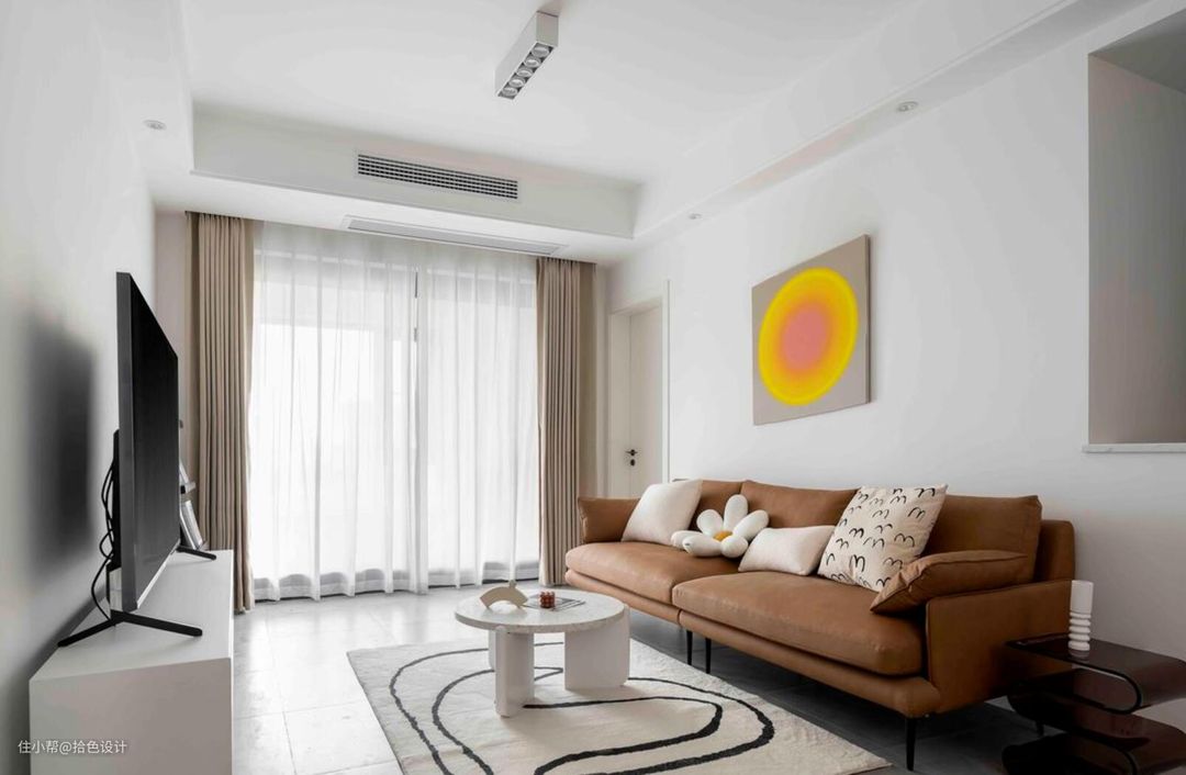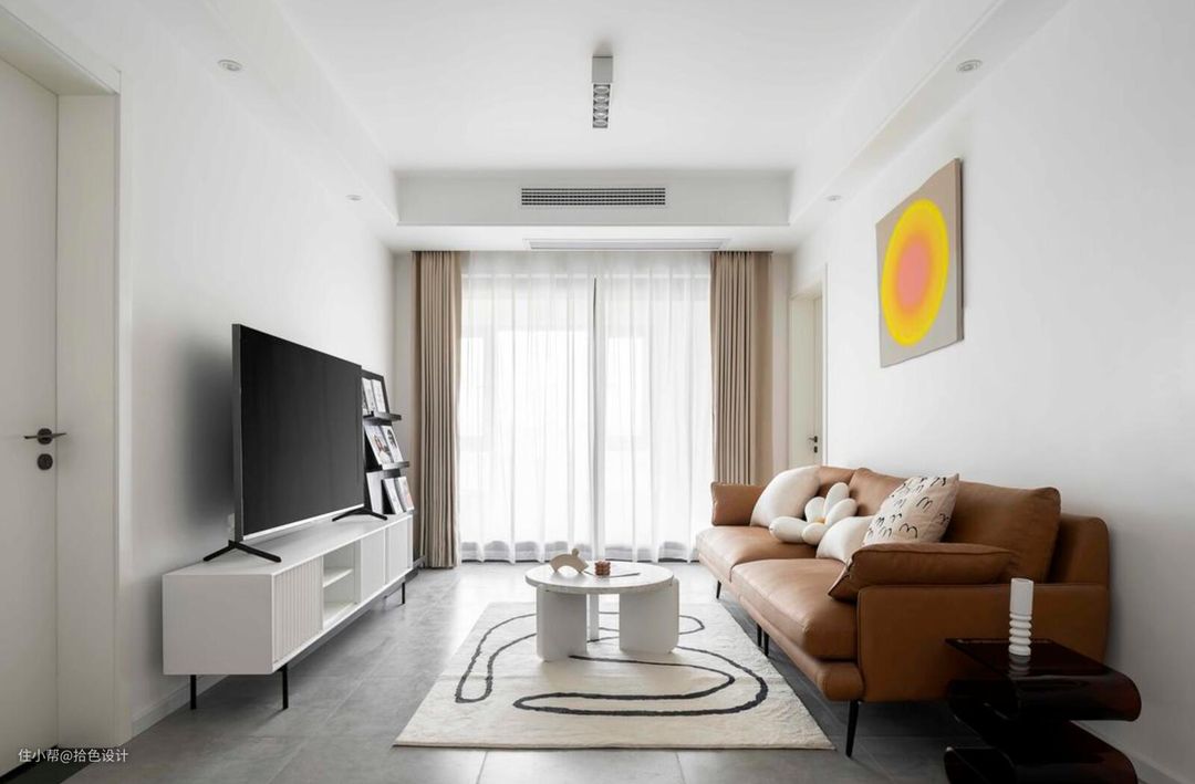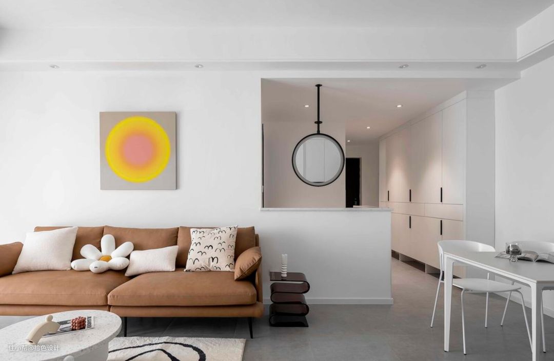 客厅依然以简约的白色乳胶漆为主,不仅仅是为了节省成本,也是为了间接性提高空间的亮度。顶面放弃吊灯,并选择明装筒灯来代替,既弱化了空间的复杂,又再次起到了节省成本的作用。而外面的阳台,由于是以生活区定位的,所以就没纳入室内了。