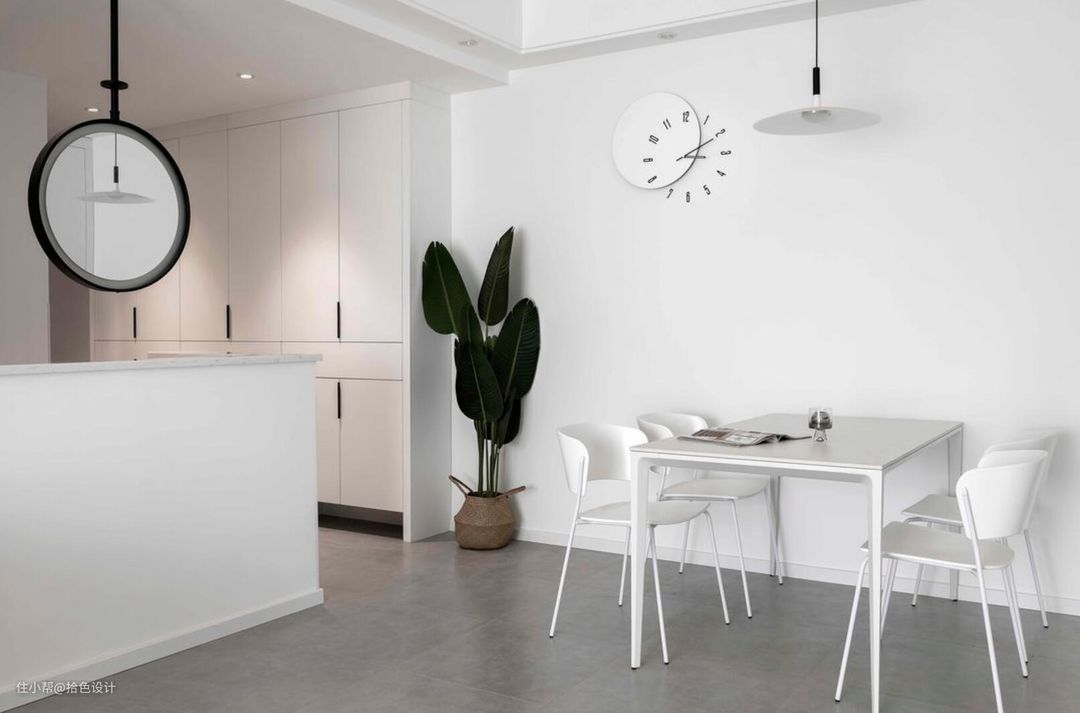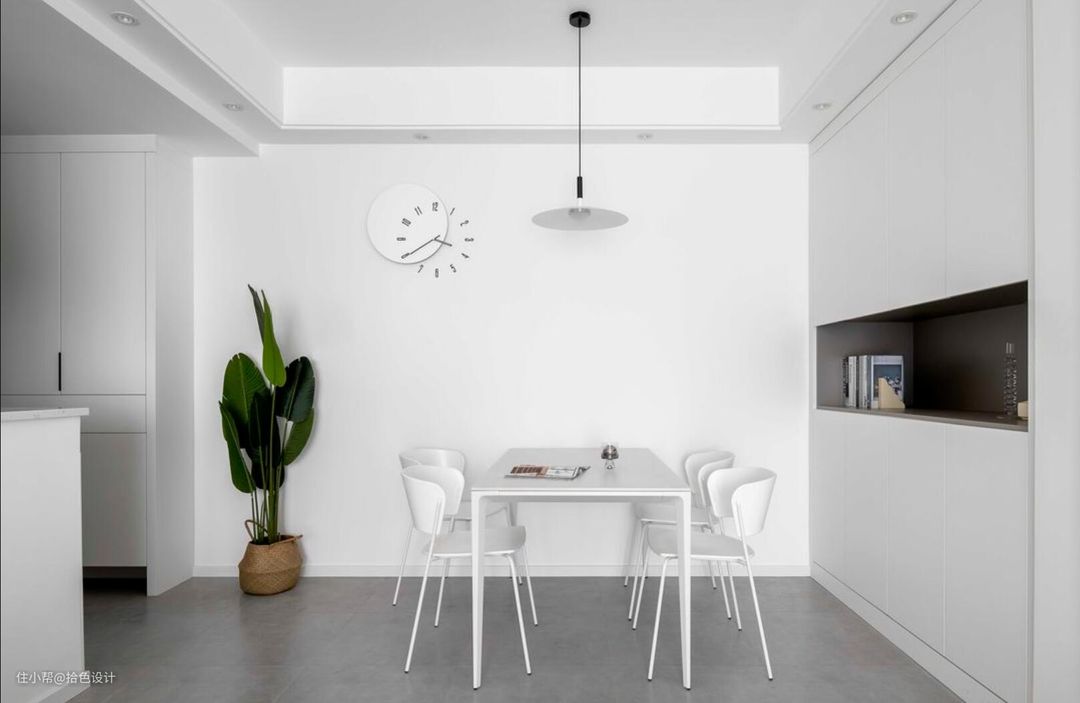 没有多余的设计,也没有华丽的色彩,直接配置一张浅白色的餐桌,看起来既大气又很显气质。再搭配上一盆绿植,又立马有了北欧小清新的格调。同时,与侧面的内嵌式餐边柜,也做到了完美融合。