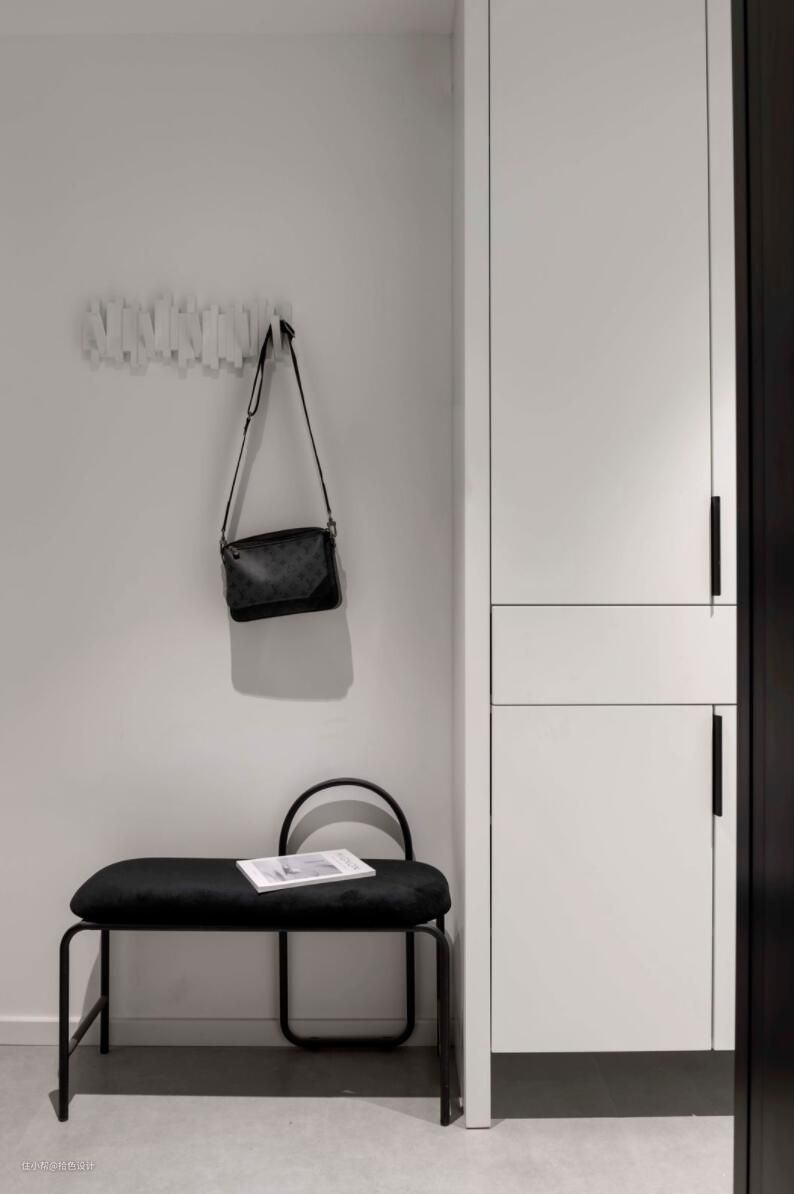 灰色的地砖、白色的墙面,从一进门开始,就为空间奠定了简约的基调。考虑到入户过道比较狭长,距离入户门一米左右的位置来设计鞋柜,可以很好地缓解入户拥堵性,并且充分利用了空间。当然,鞋柜与入户门之间的这块空间也没有浪费,配置上换鞋凳、挂衣架后,也算是完善了入户的功能性。