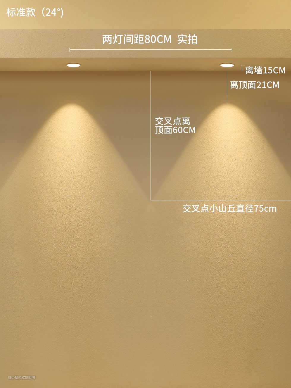 24°光束角:光线均匀,轮廓清晰,天花到地板过渡平滑,从上到下洗墙,使墙面不单调。
