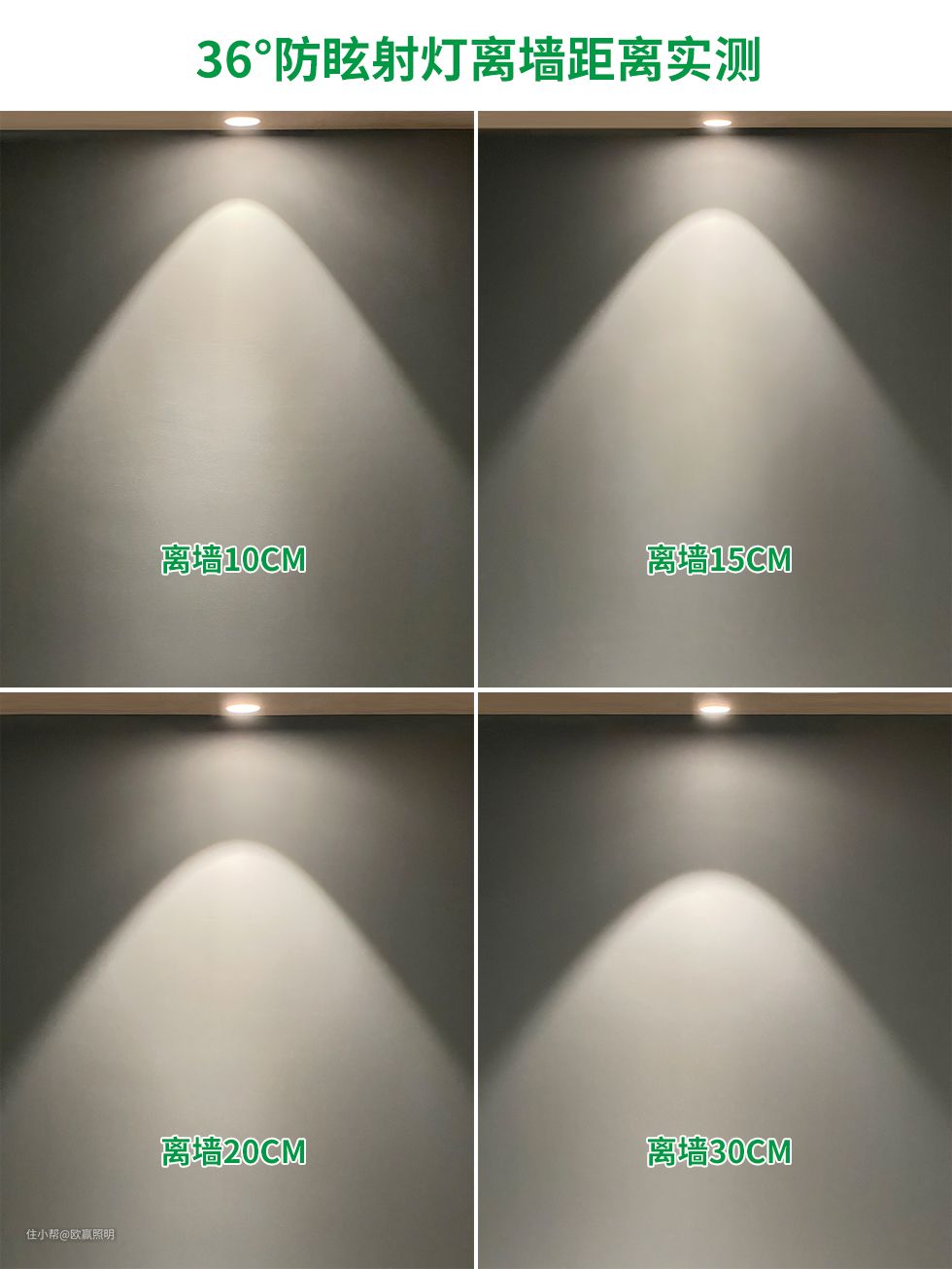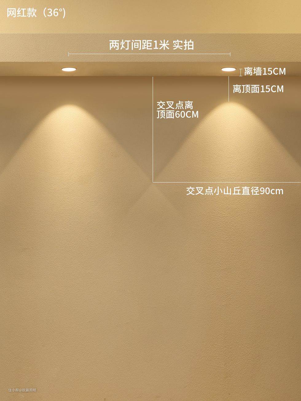 嵌入式洗墙射灯的离墙距离一般都是在10-30cm的范围(因为边吊基本都在40cm以内),这个离墙的距离很多亲们都不好把握。边吊的宽度,墙面的颜色,挂画的大小,特别是单眼皮跟双眼皮吊顶因为宽度的原因导致离墙距离过近,出不来效果,容易翻车。