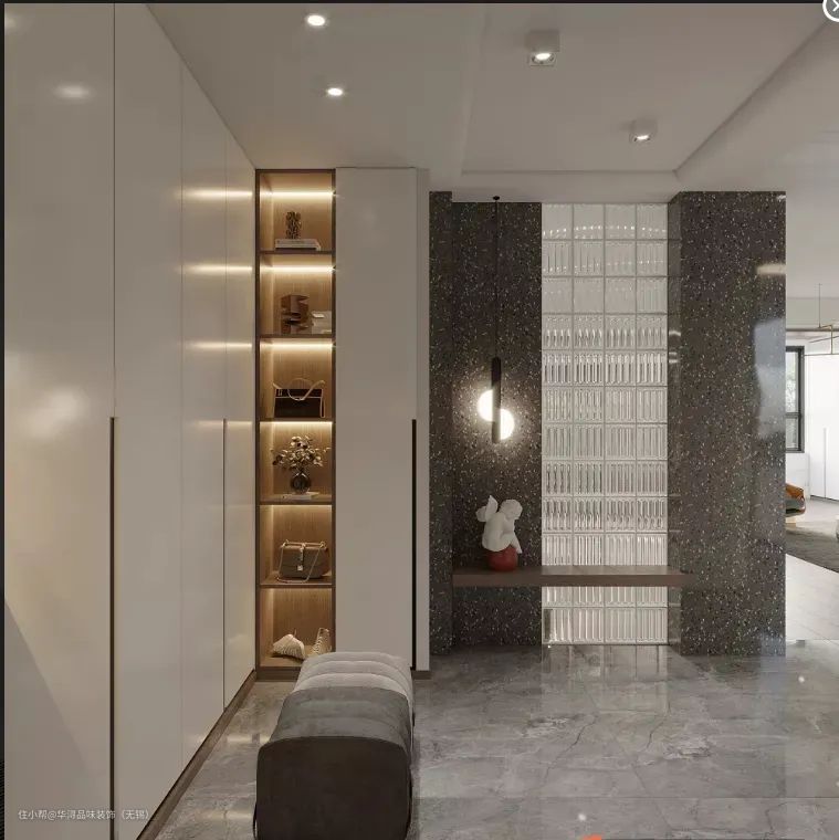 在门厅的顶部,鞋柜的内部都可以设计上感应灯。这样可以让人一打开房间,都能有家的感觉。而且分层、分区的设计形式,也多了一些现代感,不需要人为去打开灯光,就可以享受便捷的灯光效果。