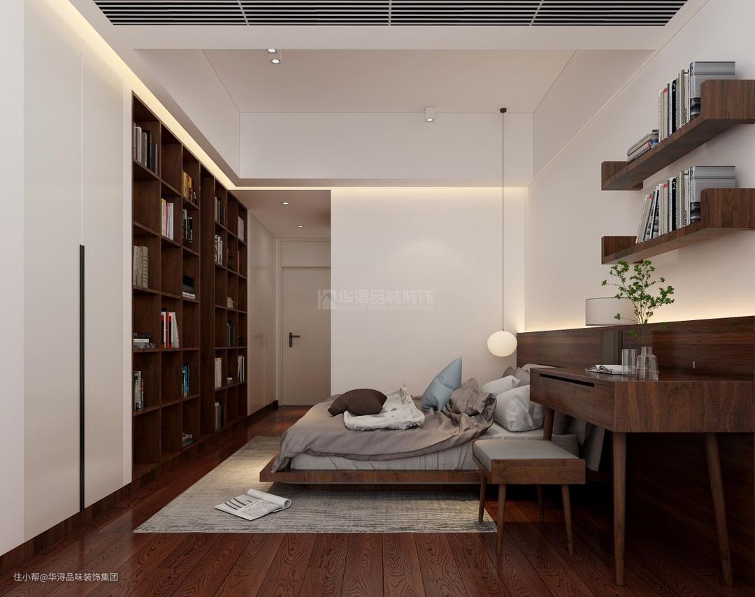 同时在卧室内设计师利用了嵌入式的衣柜和书柜来作为卧室的背景墙。同时利用了简易的书架和书桌设计为业主的简易办公和休闲方式创造了功能性区域。
