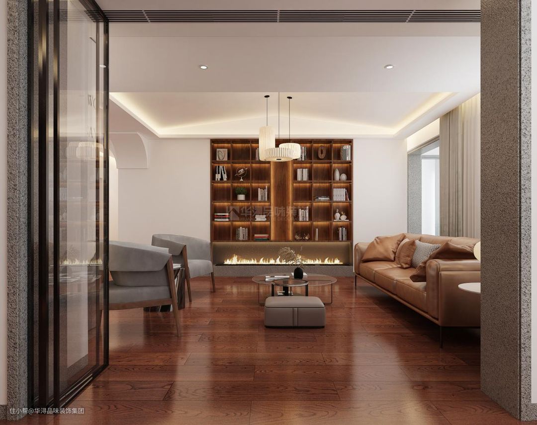 对此设计师通过铺设深棕色的木地板来体现家庭的温馨氛围,同时利用深棕色的木地板和深棕色的橱柜书柜等储物空间进行呼应,凸显整体空间的中古风,之后设计师通过利用皮质,布艺与木质的材料对比,展现现代与中古风格的杂糅。