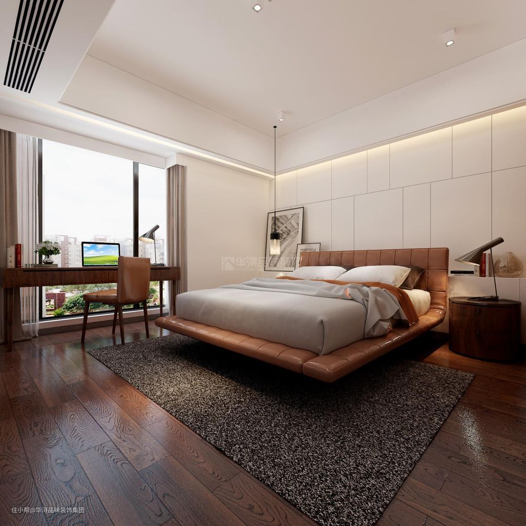 在主卧的采光上,设计师同样利用了落地窗的形式,增大空间的采光在灯光的选择上,设计师选择了床头灯和床头吊灯,用这两种方式来满足业主在睡前的光照需求同时利用了屋顶上的小壁灯来柔和空间的质感,吊顶边中嵌入灯带,来营造卧室的整体氛围。