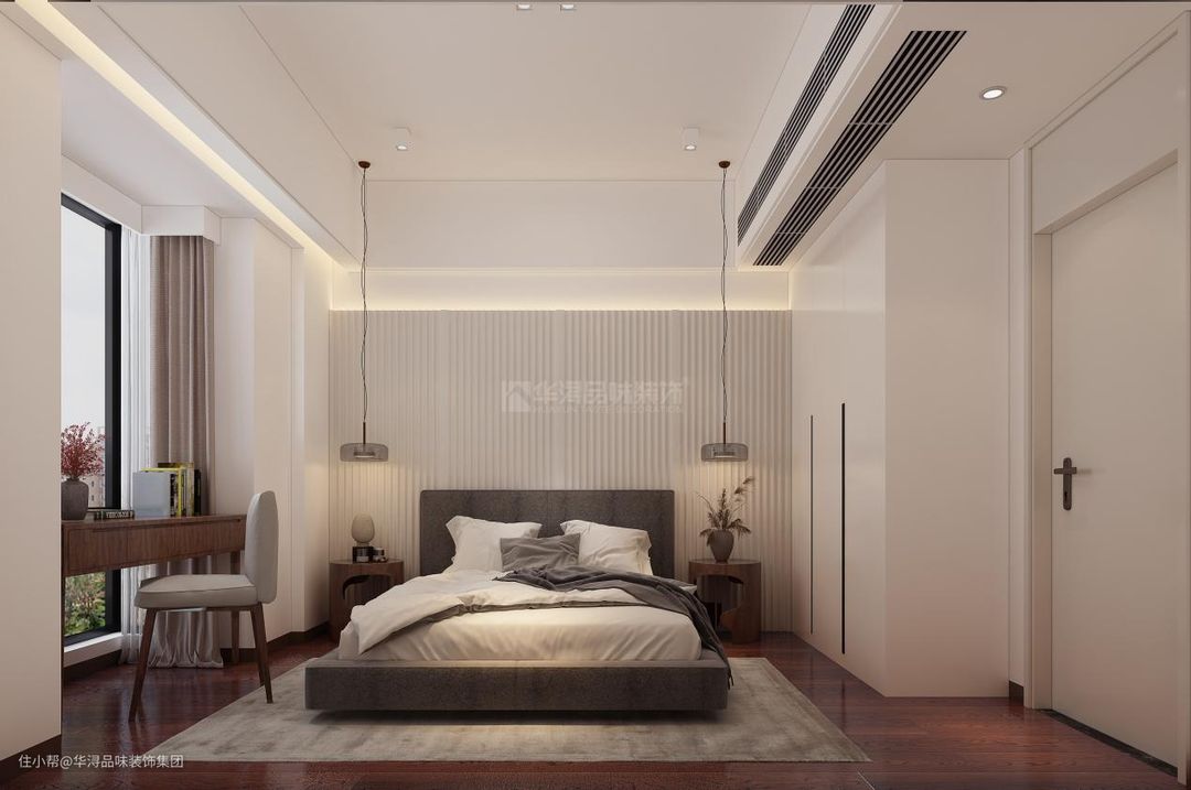 在客卧的设计上,设计师同样利用了在窗边设计简易书桌的方式丰富客卧的功能,利用一体化的白色衣柜做为客卧入门的小转角,两侧的小吊灯来满足户主的光照需求。