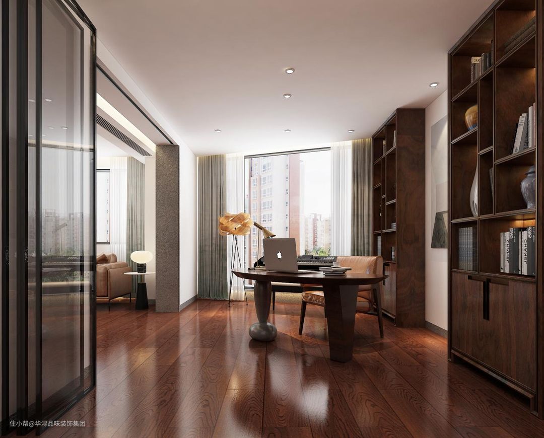 在书房的设计上考虑到书房的办公和学习需求,设计师同样利用了落地窗对书房进行采光,设计师利用了两个分开的书柜来满足书房内对书籍的住房需求,在书柜的中央,设计师利用了简单的现代抽象画来丰富空间的艺术感和学习氛围。