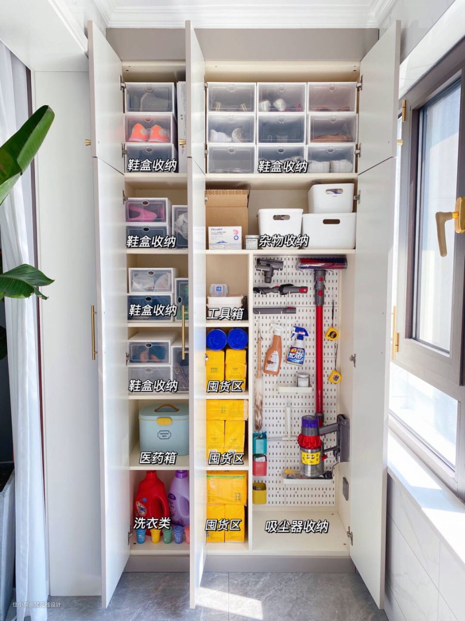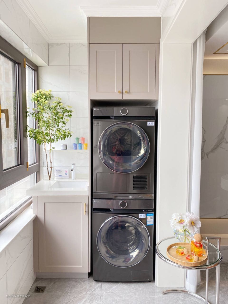 这个空间除了满足晾晒洗衣需求,一定要合理设计储物空间,不占据家里的活动区且能储物。
