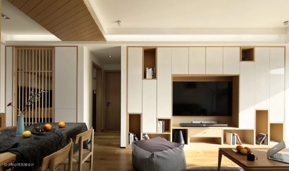 客厅从原来观影娱乐的功能慢慢减少,越来越多的家庭会在客厅看书、做游戏、早教交流等。随之客厅需要随手拿的物品越来越多,为什么不将电视柜做一整排的柜子呢,实用美观,为小户型家庭又增加大几平米的储物空间。