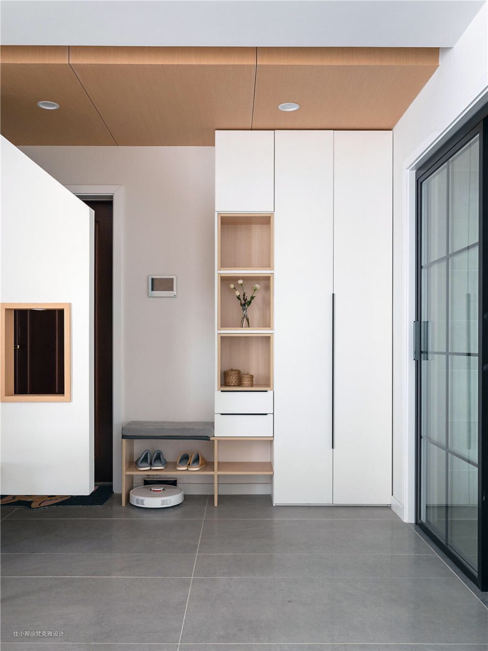 随着生活习惯的变化,门厅起着至关重要的角色,兼具换鞋、整理仪容、收纳等功能。特别是近两年人们对防护以及卫生清洁,希望在入户就能完成消毒清洁的工作。