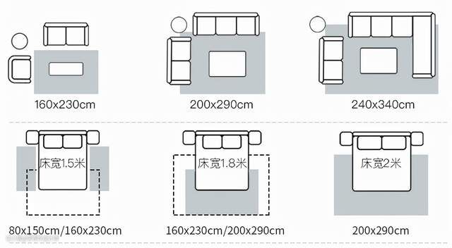 地毯尺寸选购,具体还是要根据沙发或者床的大小来定,尺寸参考↓↓↓