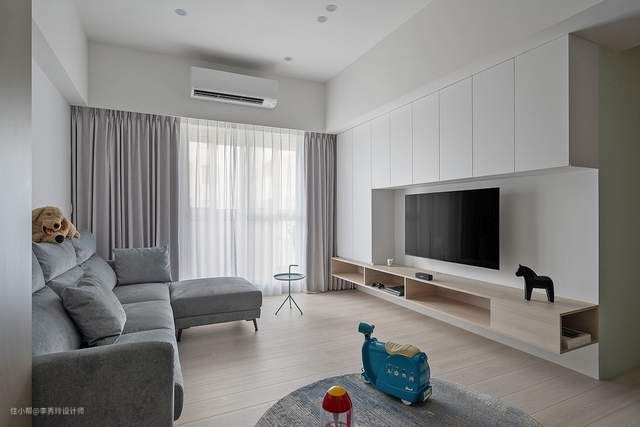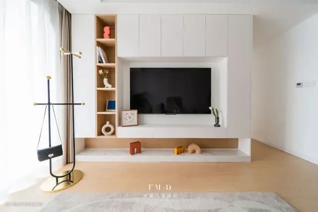 为了提高收纳,电视墙做满墙柜体,也是很常见的。