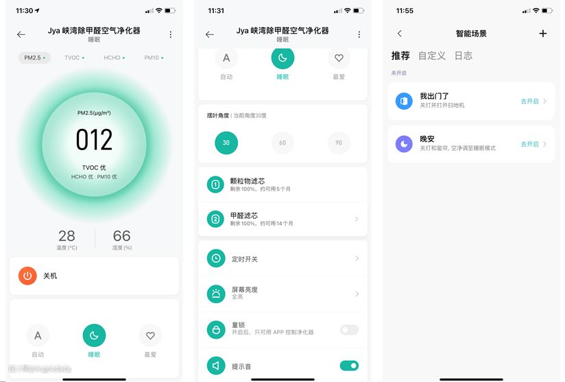 ▲更可通过米家App调整空净模式、摆叶角度、屏幕亮度、提示音,查看滤芯可用剩余时间。更可定制智能场景,比如出门后关闭空净;污染指标达到一定指数级,空净调整为自动模式,净化空气,生活真是越来越智能了!