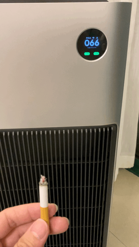 ▲当我拿出戒了十多年的“华子”后,猛吸了几口,把烟吐向空净,显示屏数值瞬间飚到600,因为空净在自动档上,开启自动洁净后,随着出风口风量的增大,明显周围的烟也被吸入其中,并且净化出洁净的空气。