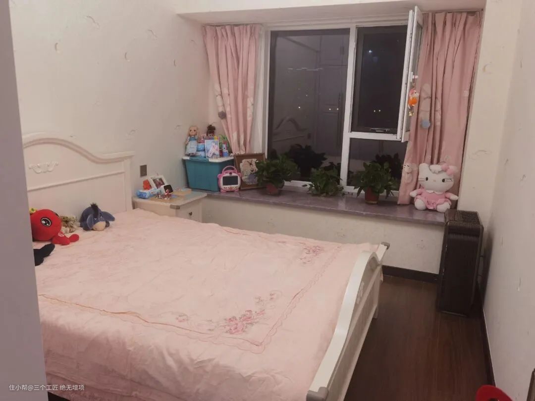 儿童房有一张床和一个衣柜,所以基本没有多余的空间。凸窗没有被打掉,但可以当沙发用。其实挺好的,视觉上也比较大气。地板铺木地板,没有瓷砖的冷冰冰感,特别舒服。