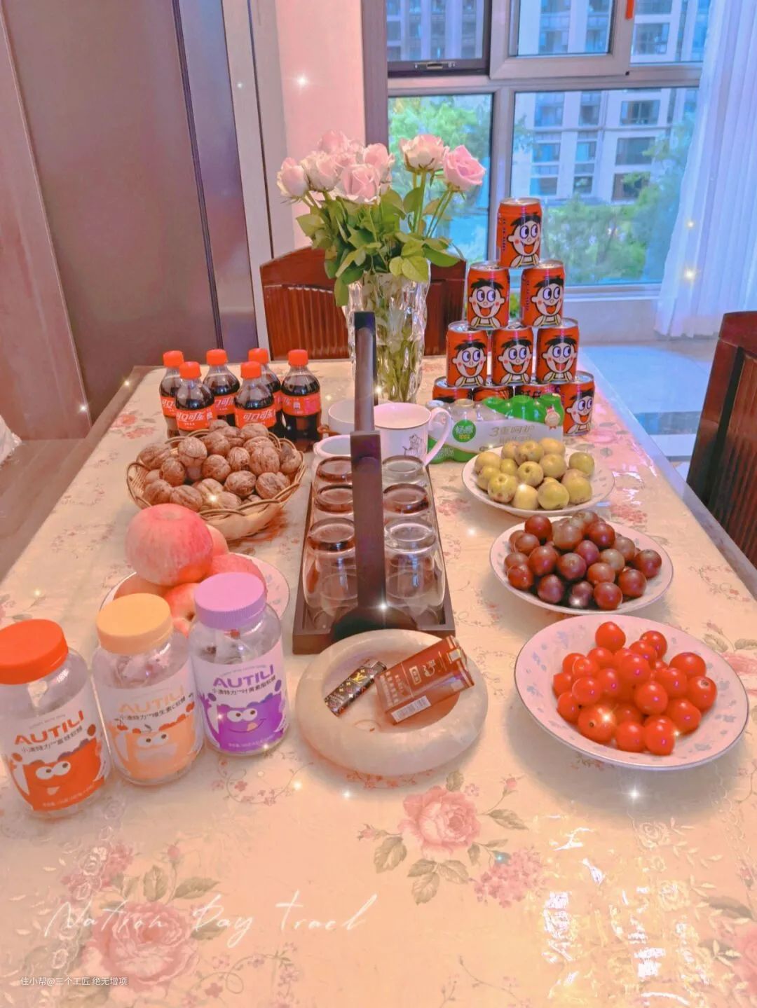 搬新家的那天,准备了一些简单的吃的喝的,搬的时候很开心很开心。事实上,一张方形餐桌仍然可以容纳相当多的东西。全家人坐在一起吃饭真开心!
