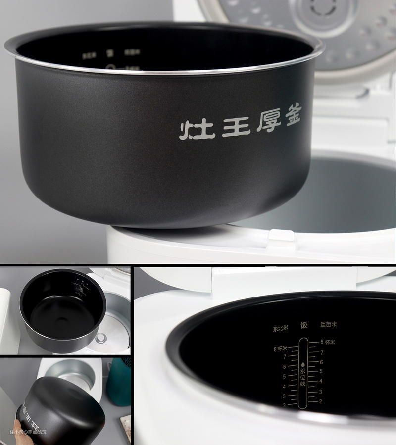 底部电热盘做了内凹弧面,与之对应的是底部有微微外凸的内胆,二者接触面积更大,890W功率,煮饭时可以提升米粒熟化速度。此外,双感温探头的设计(底部1个、上盖1个),可以保证煮饭煮粥不容易溢锅。