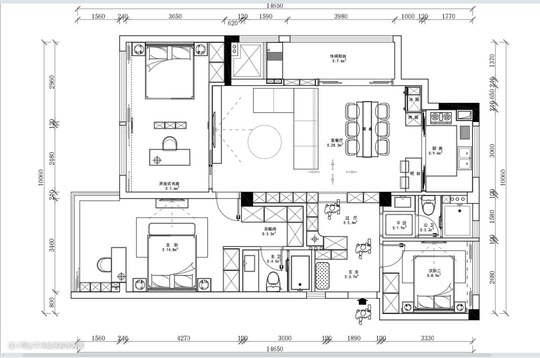 - 客厅、餐厅放在同一空间,保证空间更完整,更有体量感。