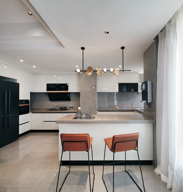 - 厨房设计成U型,在靠近餐厅的一侧设计岛台。