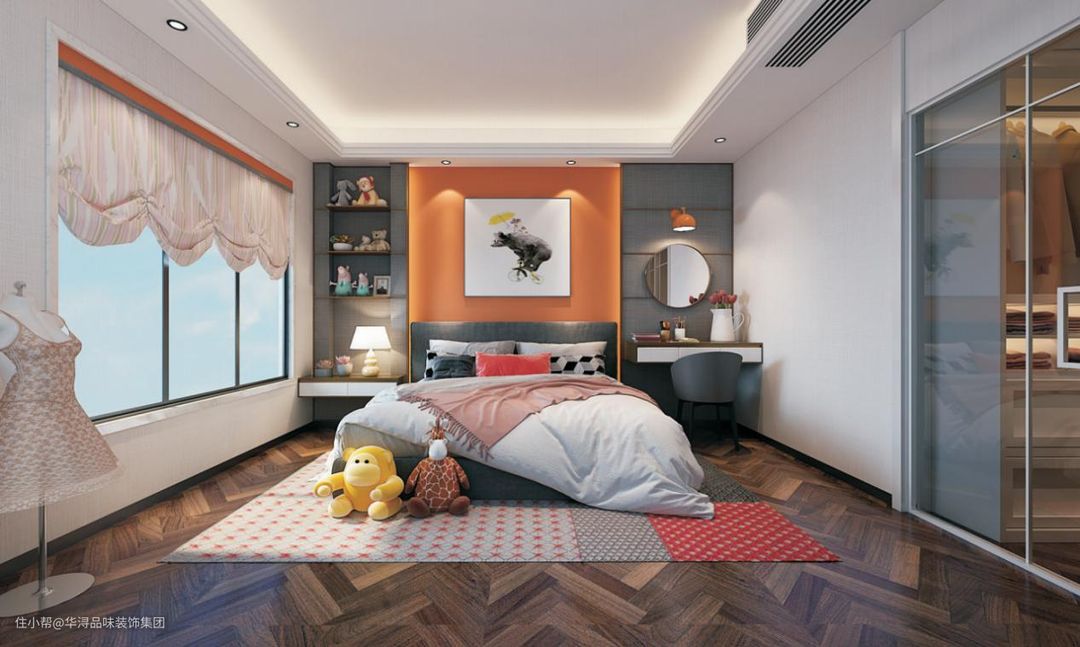 在房间的软装和配色方面,使用了大量的卡通玩偶作为装饰,让卧室充满童真童趣。窗帘、床品等粉嫩的色调也更符合女孩温婉可爱的特点。床头背景墙的橘红色在丰富了卧室色彩的同时,更增加了卧室的视觉温度,更能让小女孩感受到温暖和安全感。