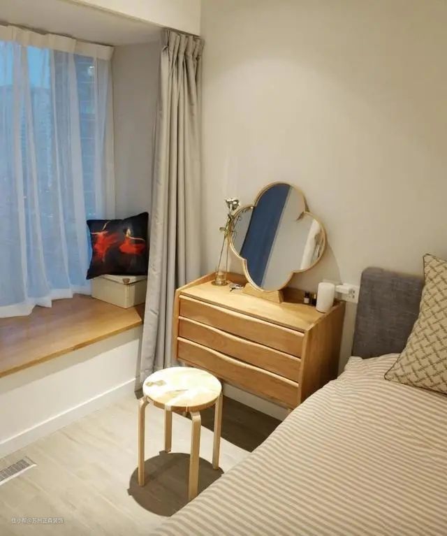 如果使用罗马杆,一般拉上窗帘,飘窗就被隐藏起来,原本狭小的空间就显得很压抑,把飘窗露出来,显得卧室空间开阔一些。