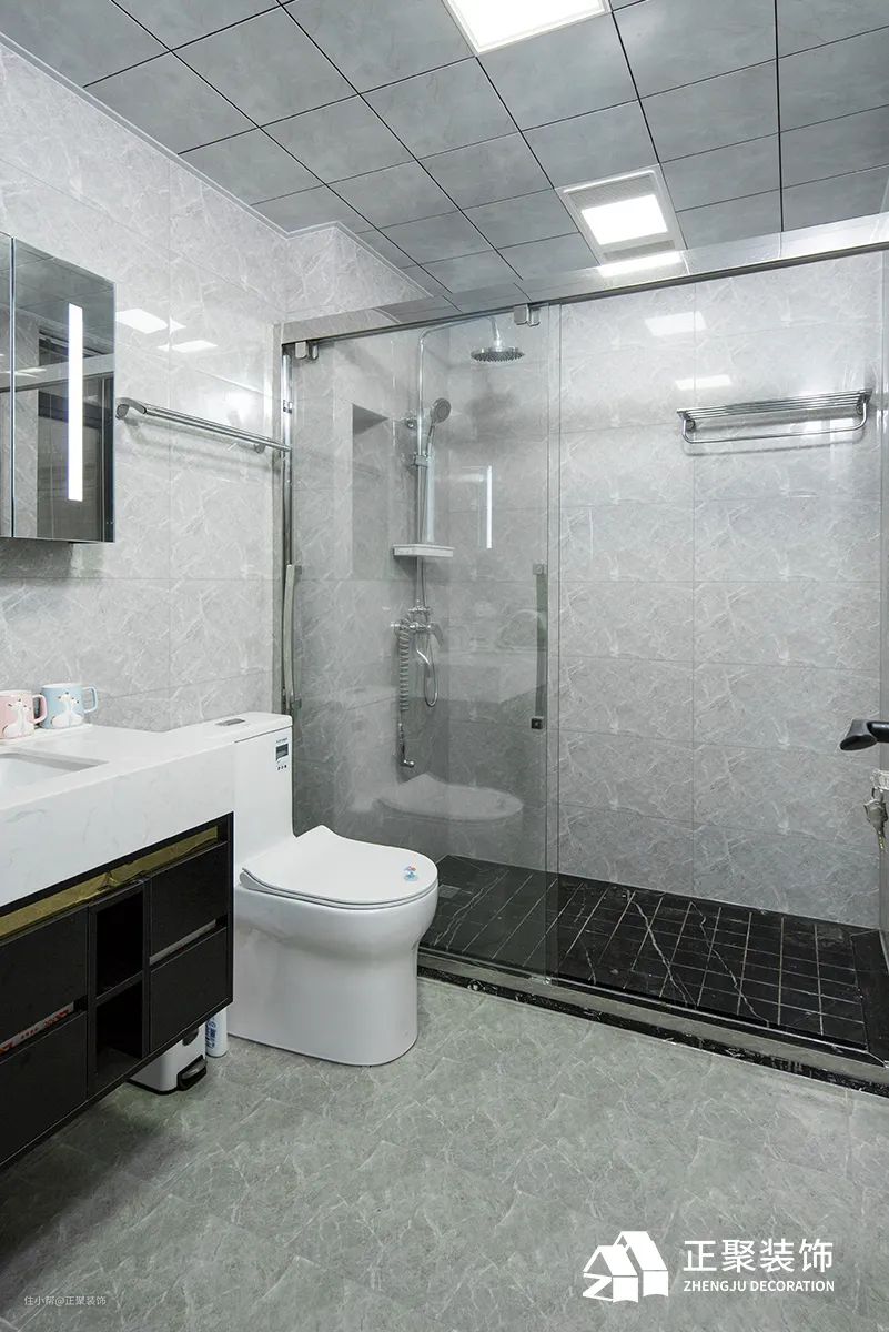 卫生间内部做了干湿分离的设计,淋浴房内的地方和马桶后方铺贴了花纹砖,给卫生间带来了更多的装饰感,整体黑色的氛围显得更为时尚。