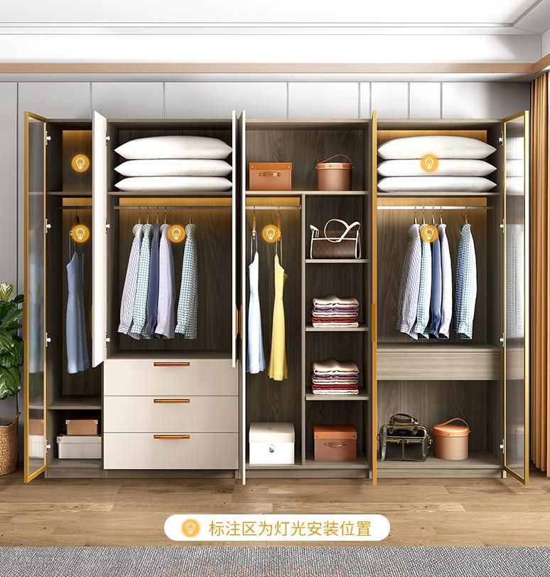 此款组合衣柜全系都是环保板材可即买即用。柜门除常规外还有玻璃门可进行选择,虽说大叔不喜欢玻璃门,但是长虹艺术玻璃的确受很多年轻朋友的喜爱,系列里的钢化玻璃门,在曲线质感和透明度上都把控的刚刚好,智能感应灯的加装能更好的帮助女主人进行服饰彩色的搭配,开门即亮,提高我们的生活便捷度。