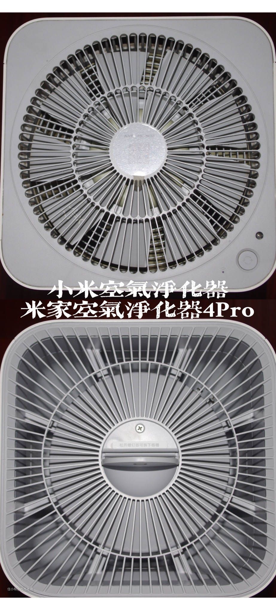 当初的净化器顶部是采用卡槽式的设计,顺时针转动格栅就可以拿下来了。现在是设计成了螺丝的,顶部的小翻板是磁吸在螺丝的顶部。我想这样的设计包括隐藏风扇的设计肯定是为了安全。