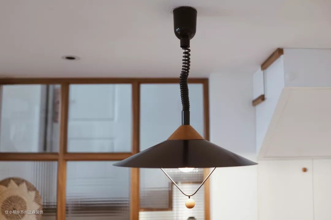 餐厅家具也花了屋主和设计师不少的心血:餐桌为老榆木实木定制,Art deco风格的拱形镂空靠背皮座面餐椅,也是设计师在老货仓库实地验货后入的,特别有CP感的伸缩吊灯海淘自德国中古灯具店,藤面餐椅来自某宝韩国代购。