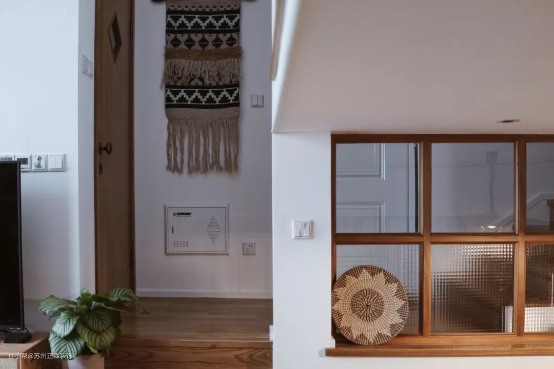 楼梯选用橡木,纹理比较粗犷,搭配用来遮挡难看强电箱的民族风挂毯,风格呼应统一。