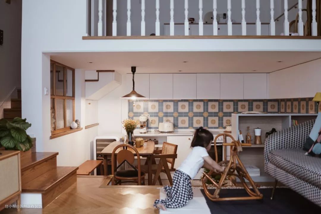 萌娃抢镜!这张餐厨区正脸照,将楼梯以及部分二楼的布局也一起带入了镜头。