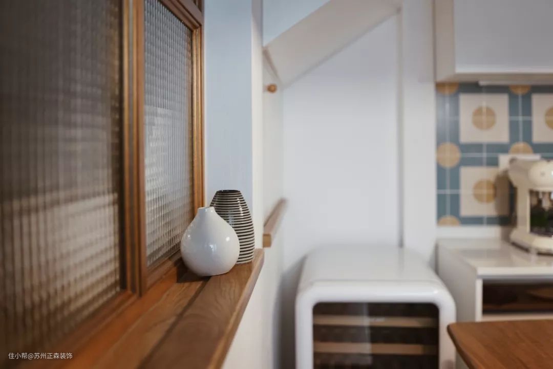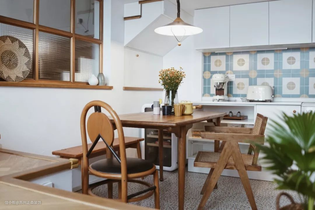 圆点花砖和彩色仿水磨石地砖,给了厨房间童趣混搭复古的基调。