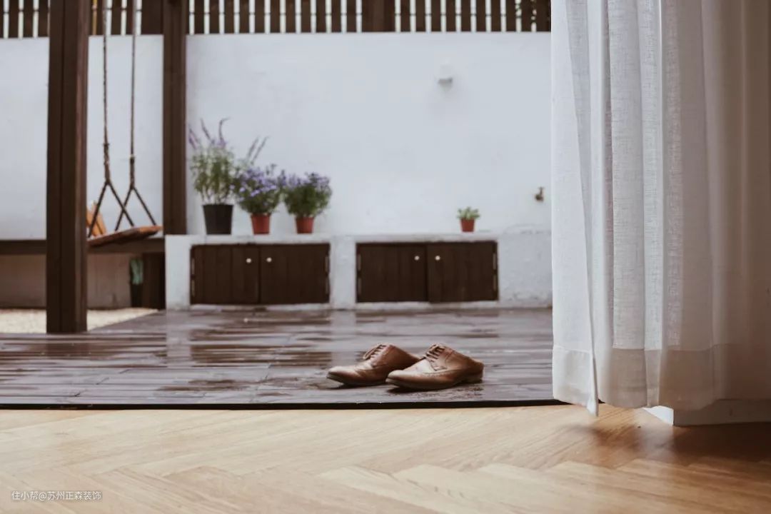 院子所有墙面都刷了白色户外漆,批腻子的时候设计师特意关照师傅不要砂平墙面,保留自然斑驳的肌理,这样才符合老上海的感觉~