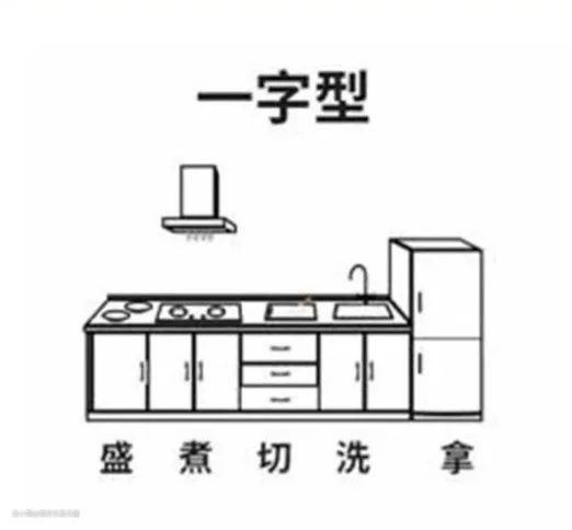 一字型设计,是指厨房的所有操作走位都是在一条直线上来完成的,各区域依次使用,一条动线贯穿做饭整个流程。这种设计多见于小户型。