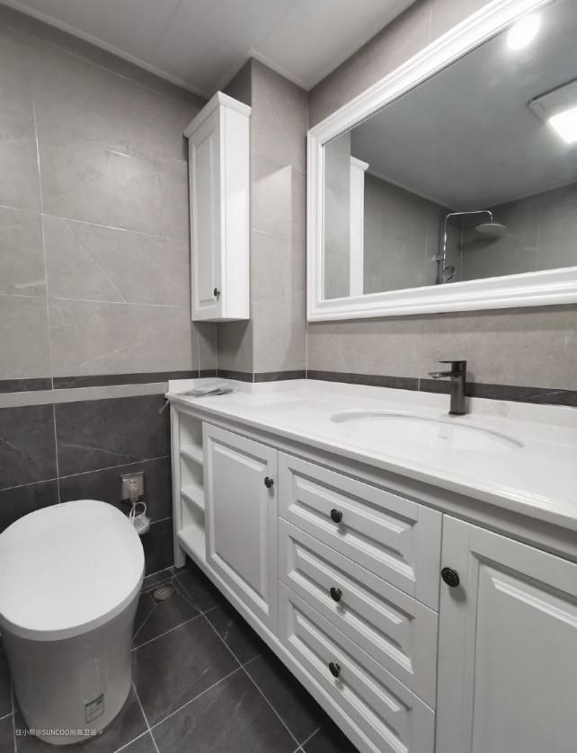 屋主选择了白色的柜体,门板选的是带美式的简约线条造型,考虑到收纳空间可能不够,就在从侧边设计了一个吊柜,这样化妆品不愁没地方放了。马桶坐厕的柜子设计成了开放格,可以放纸巾等小物件,纸巾盒支架也不用单独买了。