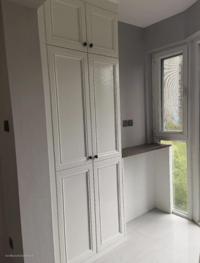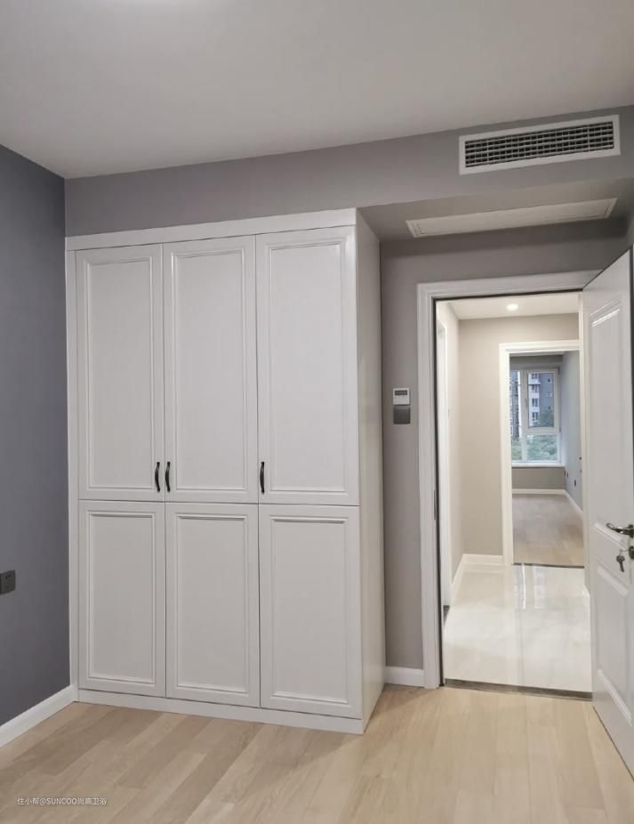 主卧选择了美式纯白的衣柜,可以收纳家里所有的衣物和其他杂物,地板选择了木地板,冬天的时候开了暖气走在上面暖乎乎的。