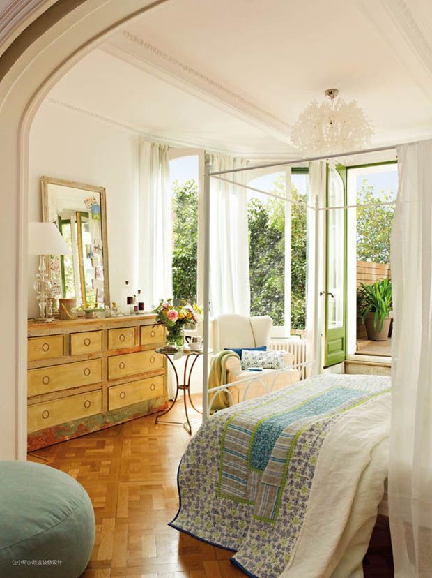 带阳台的卧室,这个房间可能是很多女孩子的梦想卧室。高高的天花板,使房间通风顺畅。墙壁漆成白色,地板铺有木纹瓷砖,门和玻璃窗打开以接收阳光。床上设置有 4 根柱子、柔软的白色床垫、毯子、柔软明亮的图案靠垫、带抽屉的木架子,可以放很多东西。虽然年代久远,但它的美丽永不褪色。阳台、舒适的休息区、井井有条的转角长椅,这间卧室,给人带来很多欢乐和放松。