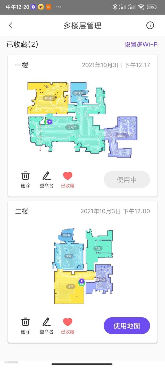 然后让机器进行清扫,第一遍清扫也是构建地图的过程,机器支持多楼层管理,最多可以记忆10张户型图,每张户型图都可以进行命名,删除,收藏等编辑,这样对于多楼层用户就比较友好。同时如果你家不同楼层用的是不同的网络wifi,使用起来也没有问题,因为机器支持添加3个wifi,不同wifi间会自动切换,所以清扫不会离线。