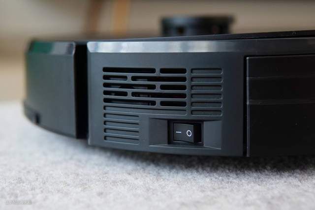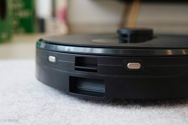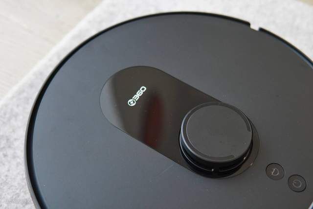 整机采用了低调的黑色,可以看到材质有哑光和亮面两种,上盖大部分区域是细腻的哑光磨砂材质,激光头所在的中心区域和logo处是亮面材质,再加上两个亮面按键的点缀,整体造型大气简约。有一说一扫地机器人还是黑色最合适,不显眼又和家居环境适配度比较高,看久了也不会觉得突兀。