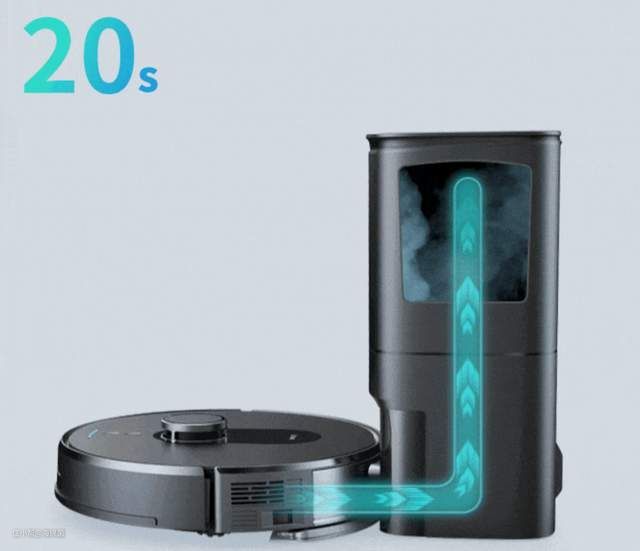 接下来将尘盒装回机器,自动集尘的部分完全无需手动操作,机器回充后会自动开始,20s就能完成了集尘,机器采用了后吸式集尘,搭配大功率风机,风道短且不易堵塞。