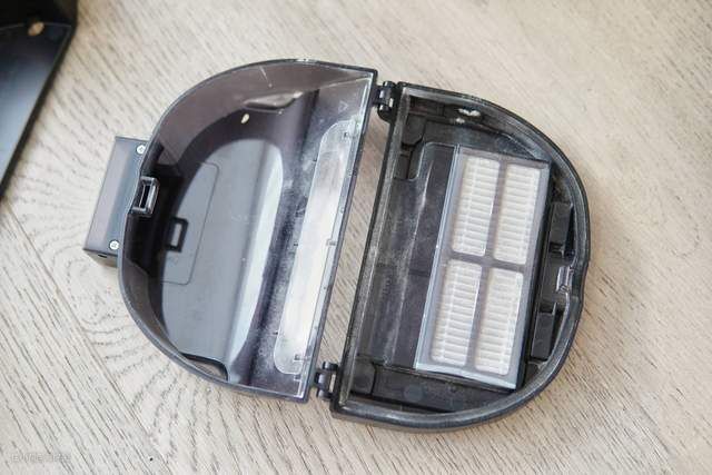 两者看似一体,但其实一拉就能分开,左边是水箱,右边则是尘盒,尘盒体积比较小,但因为机器有自动集尘功能,尘盒只需要容纳单次清扫后的垃圾就可以,这样的大小其实已经绰绰有余了。